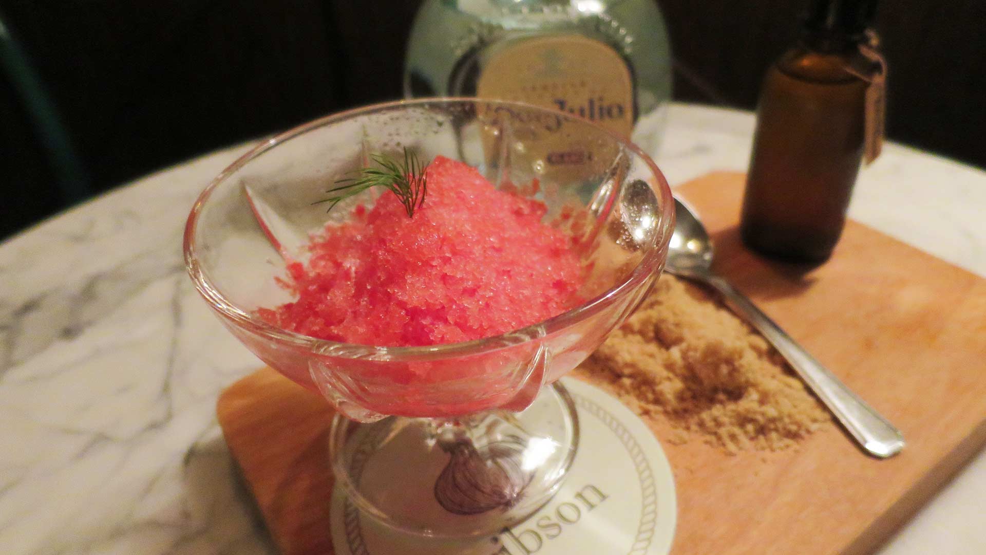 Quite unusually, the cocktail was served as a granita, which was made by freezing watermelon, orgeat, Tio Pepe Sherry and Don Julio Blanco Tequila, then shattering the ice into a million tiny shards. The result resembles a gentle bed of pink sand. The theme is taken further with a side serving of edible brown “sand” (which one strongly suspects to be finely ground biscuits) and a sea salt spray.