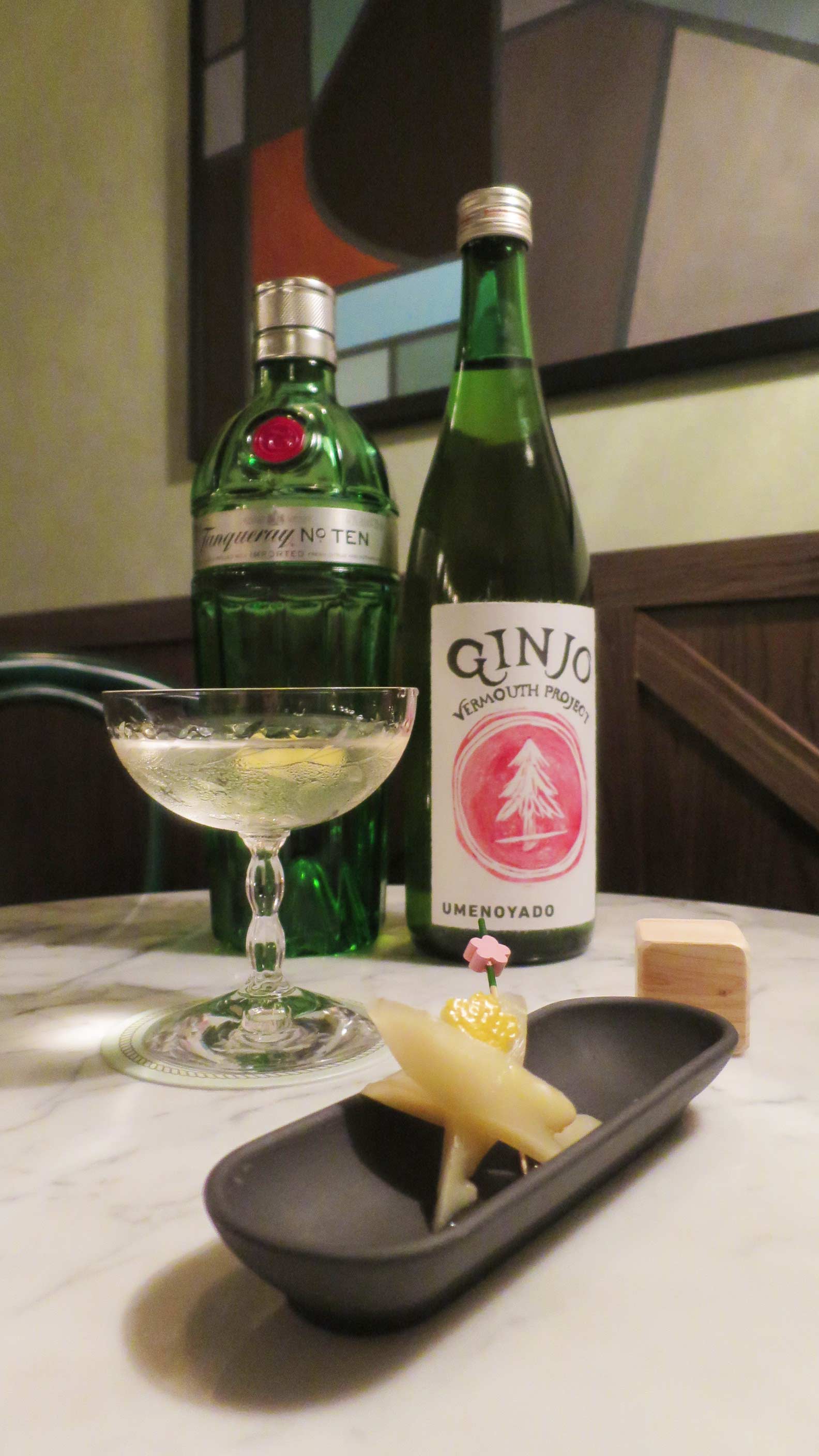The subtlest, but largest change is that of the choice of ingredients. A traditional Gibson is simply a martini served with a picked onion. Here, Tanqueray Ten is used as the base, but the vermouth is made of sake! Umenoyado Brewery was commissioned to produce an exclusive batch of the vermouth, which blends traditional botanicals like wormwood, Japanese ingredients like wasabi, Hinoki oak, and yuzu, and Southeast Asian flavours of pineapple. In addition to the traditional onion, pickled ginger prepared in a special brine by sushi master Ashino Takumi is also served as part of the drink.