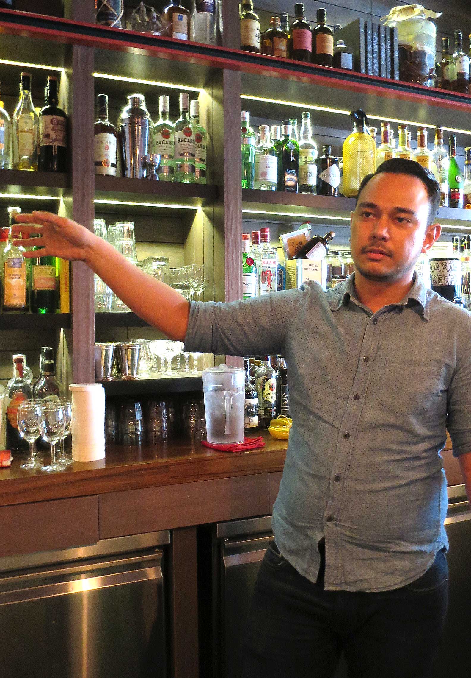 With the introduction over, it was time to get our hands dirty (not literally, of course). It’s one thing to make a couple of gin and tonics at home, but it’s quite another to get behind a commercial bar and shake some cocktails. Just keeping track of the dozens of bottles of spirit, syrups bitters and juices behind the counter is no mean feat. A typical cocktail has anything between three to five ingredients. Multiply that by, say, 10 different cocktails, take away some for overlap, and you can have anything from 20 to 40 different ingredients sitting around the bar. It’s bewildering.